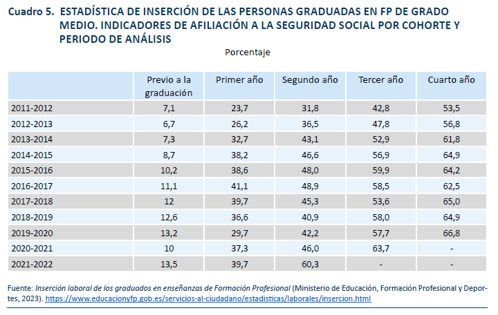 El aumento de la matrícula en FP Media muestra que este nivel educativo ha mejorado su reputación en España, como ya lo hizo previamente la FP de Grado Superior, alejándose de la imagen de ser un itinerario para estudiantes con dificultades académicas. El aumento en la matrícula de FP Media es el resultado de la disminución del número de jóvenes que no prosiguen sus estudios después de finalizar la ESO o que ni siquiera titulan en la ESO. Una de las razones por las que la FP de Grado Medio ha mejorado su reputación, ha sido su inserción laboral. El cuadro 5, extraído del Informe anual “Inserción laboral de los graduados en enseñanzas de Formación Profesional” del Ministerio de Educación, Formación Profesional y Deportes de diciembre de 2024, ilustra la trayectoria de la tasa media de afiliación laboral de los recién titulados en ciclos formativos de Grado Medio desde el curso 2011-2012 hasta el curso 2021-2022, durante los cuatro años siguientes a su graduación. El cuadro resalta que los jóvenes que se gradúan en FP Media tienen una tasa de afiliación a la Seguridad Social relativamente baja en su primer año, después de la finalización de su título.