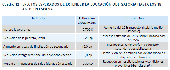 La extensión de la escolarización obligatoria hasta los 18 años en España es una medida con potencial para reducir el abandono escolar temprano, incrementar el capital humano del país y fomentar la cohesión social. La evidencia empírica de diversos estudios internacionales muestra que un año adicional de educación tiene efectos positivos significativos en los ingresos laborales, la empleabilidad, y la estabilidad económica de los individuos. Además, prolongar la educación obligatoria puede mejorar habilidades no cognitivas y sociales, que son cada vez más valoradas en el mercado laboral globalizado actual.