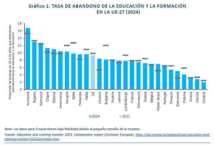 Durante la última década, la UE ha registrado una tendencia decreciente en la tasa de abandono escolar temprano. Sin embargo, este avance no ha sido homogéneo. Aunque más de la mitad de los países ya cumplen el objetivo del 9 %, otros como Rumanía (16,8 %), España (13,0 %) o Alemania (12,4 %) siguen presentando tasas elevadas. Por el contrario, Croacia (2,0 %), Irlanda (2,8 %) y Grecia (3,0 %) lideran en cumplimiento.