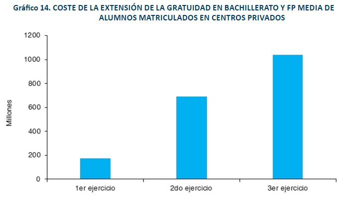Ahora bien, esta medida también implicaría un esfuerzo presupuestario adicional. En términos presupuestarios, el escenario agregado supone un incremento cercano al 2,3 % del gasto educativo público (≈ 1.450 millones de euros, ~0,11 % del PIB). Esta cifra resulta de sumar, por un lado, la escolarización de jóvenes de 16–17 años actualmente no escolarizados (≈ 416 millones de euros) y, por otro, la extensión de la gratuidad en Bachillerato y FP de grado medio para el alumnado hoy matriculado en privada no concertada (≈ 1.038 millones de euros). Como escenario acotado, si se considerara únicamente la extensión de la gratuidad, el esfuerzo se situaría en torno al 1,6–1,7 % del gasto educativo público (≈ 1.040 millones de euros; ~0,08 % del PIB). A estos importes debe añadirse el coste privado derivado de los salarios dejados de percibir por los adolescentes de 15–17 años, estimado en torno a 95 millones de euros anuales. Además, las cifras anteriores no incluyen los refuerzos cualitativos imprescindibles (orientación y tutoría, apoyo socioemocional, infraestructuras), que deben presupuestarse aparte. Una implantación gradual ayuda a suavizar los picos de gasto y a crear a tiempo las plazas necesarias en FP, especialmente en su modalidad dual.