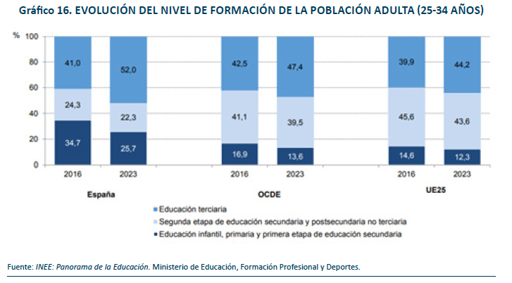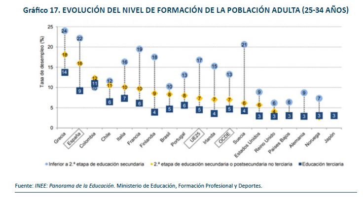 La propuesta se fundamenta en la necesidad de reducir las diferencias socioeconómicas que persisten en el sistema educativo español. A pesar de los esfuerzos realizados, el 25,7 % de los jóvenes de entre 25 y 34 años tiene como máximo la ESO finalizada, un porcentaje que duplica la media europea, situada en el 12,3 % (gráfico 16). Además, la tasa de desempleo entre los jóvenes con solo la ESO se sitúa en un 22 %, frente al 16 % de los que han completado la educación secundaria superior y el 9 % de los titulados universitarios o de FP Superior. Sin embargo, voces críticas argumentan que extender la obligatoriedad educativa no resolverá este problema si no se aborda simultáneamente la falta de atracción y relevancia de algunos itinerarios educativos, como la FP Básica o los ciclos formativos con menor inserción laboral.