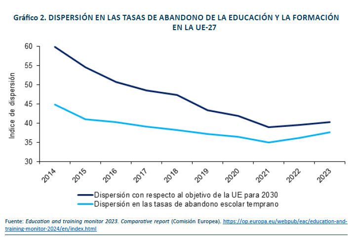 El gráfico 2 representa la evolución del abandono escolar temprano en la UE-27 desde 2014 y, en concreto, el grado de dispersión entre países. El gráfico distingue dos indicadores: