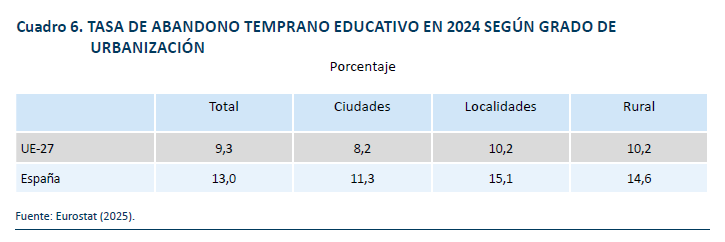 A diferencia de lo observado en años anteriores, la diferencia entre áreas rurales y urbanas en España se ha reducido ligeramente, aunque persiste un patrón claro: las localidades intermedias presentan el mayor reto. La comparación con los datos europeos revela que, a pesar del descenso general, España mantiene una brecha estructural en todos los entornos, especialmente en contextos no urbanos.