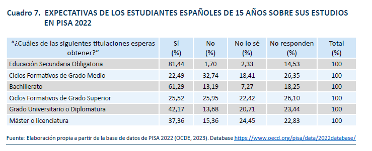 El cuadro 7 presenta las expectativas académicas de los estudiantes españoles de 15 años sobre sus estudios en la evaluación PISA 2022. Un alto porcentaje de estudiantes (81,44 %) esperan obtener la ESO. Es relevante ver que ya hay un 1,70 % de los estudiantes españoles de 15 años (que representan a aproximadamente 8.300 jóvenes) que señala que no espera finalizar la ESO. Adicionalmente, otro 2,33 % (que representan a cerca de 11.400 jóvenes) revela que no sabe si va a poder terminar los estudios obligatorios. Hay un 14,53 % que no responde esta pregunta del cuestionario de PISA, que los alumnos cumplimentan después de realizar la prueba de matemáticas, lectura y ciencias (además de otras dos competencias, la financiera y pensamiento creativo, cuyos resultados se conocerán en los próximos meses). Zamarro et al. (2019) muestra que el hecho de que un estudiante no responda a las preguntas del cuestionario puede ser un indicador de que ese alumno o alumna tiene una menor capacidad de perseverancia o compromiso, habilidades no-cognitivas muy relevantes en su futuro académico y laboral1.