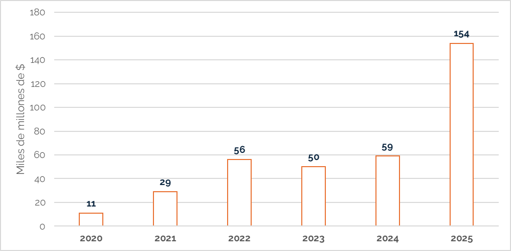 | China (infraestructura) | Hub global de blanqueo: escrow + banca clandestina | De 42.700 millones de dólares en 2023 a 103.200 millones de dólares en 2025. | Industrialización del blanqueo de fondos y rol sistémico global |