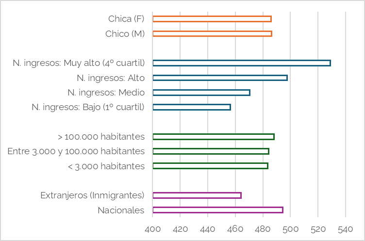 El gráfico 2 muestra las diferencias en los niveles de educación financiera de los adolescentes españoles de 15 años según diversas características socioeconómicas. En general, el gráfico evidencia disparidades significativas en el nivel de educación financiera según factores socioeconómicos, tamaño de localidad y nacionalidad. Los estudiantes de familias con ingresos muy altos (4.º cuartil) obtienen los mejores resultados, lo que refleja una fuerte correlación entre el nivel socioeconómico y el nivel de educación financiera. Asimismo, los adolescentes que residen en grandes localidades (>100,000 habitantes) superan a los de municipios medianos y pequeños, sugiriendo posibles diferencias en el acceso a recursos educativos. Además, los estudiantes nacionales superan significativamente a los inmigrantes, quienes enfrentan desafíos adicionales como barreras culturales o idiomáticas. Por último, las diferencias de género son mínimas, mostrando un rendimiento equilibrado entre chicas y chicos. Estas diferencias reflejan algunas inequidades estructurales en el sistema educativo que podrían abordarse mediante programas específicos dirigidos a estudiantes de entornos menos favorecidos, áreas rurales y familias inmigrantes, con el objetivo de garantizar una mayor igualdad de oportunidades en el desarrollo de competencias financieras.