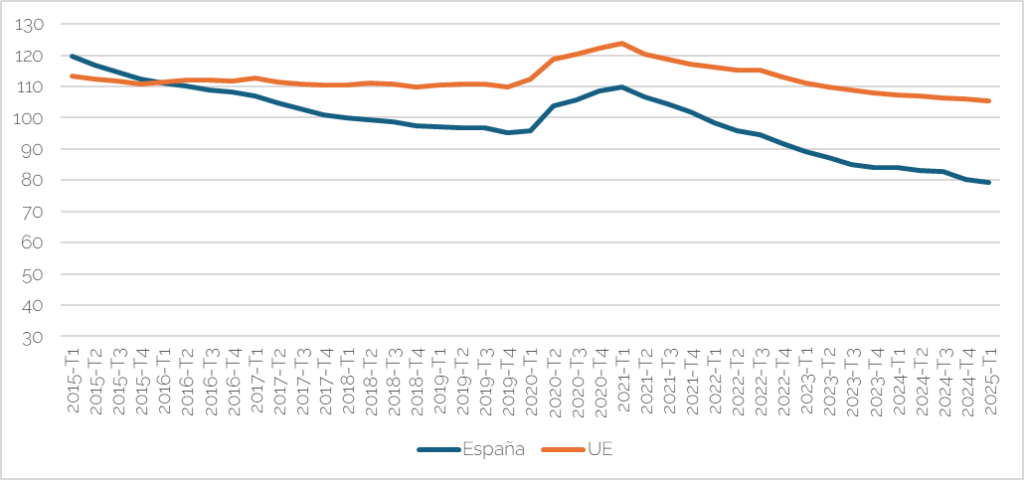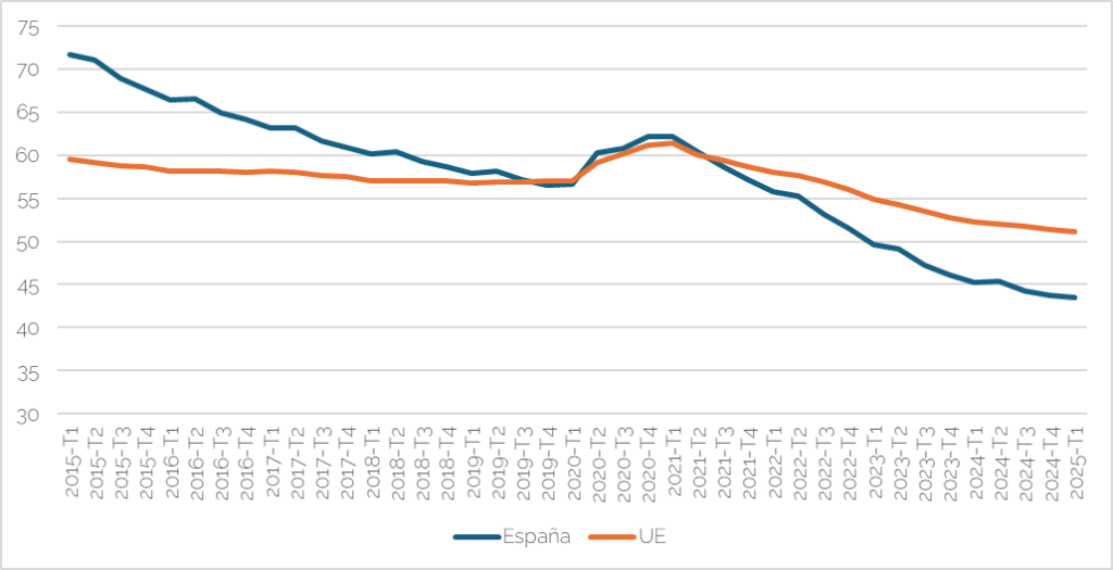 El Gráfico 1 muestra la evolución del crédito a los hogares, expresado como porcentaje del PIB, en España y en el conjunto de la UE entre el primer trimestre de 2015 (2015-T1) y el primer trimestre de 2025 (2025-T1). Al comienzo del periodo, el crédito recibido por los hogares españoles, resultado de un significativo endeudamiento hipotecario previo a 2008, era notablemente más elevado, superando el 70% del PIB, mientras que la media de la UE se situaba cerca del 60%. Entre 2015 y 2020, España experimentó un profundo proceso de desapalancamiento familiar, reflejando el saneamiento de balances y la amortización de pasivos por parte de las familias. Esta tendencia se tradujo en una convergencia con las cifras de la UE. La pandemia de la COVID-19 en 2020 interrumpió ligeramente esa dinámica de disminución del crédito. Sin embargo, a partir de 2021, la reducción del endeudamiento familiar español se aceleró, cruzando la línea de la UE a finales de 2021/principios de 2022. Durante el primer trimestre de 2025, la deuda de los hogares españoles se situó aproximadamente en el 43% del PIB, por debajo de la media europea, que se mantiene alrededor del 51-52%. Este cambio estructural no solo sugiere una mejora en la salud financiera de las familias españolas, sino que también puede suponer una menor vulnerabilidad ante futuras subidas de tipos de interés, si bien, en contraste, puede señalar una menor capacidad para impulsar la demanda vía crédito en comparación con el entorno europeo.