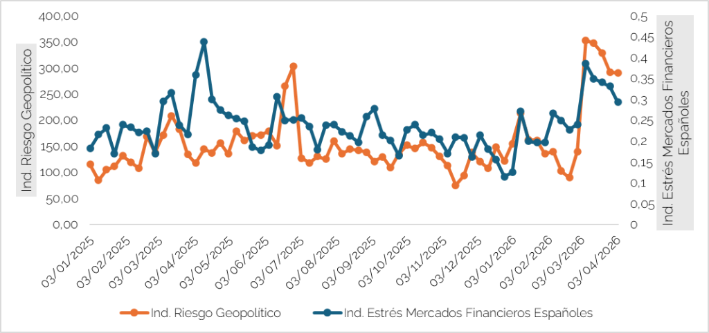 Gráfico 1. Evolución del Índice de Riesgo Geopolítico y del Indicador de Estrés de los Mercados Financieros Españoles (2025-2026/1T)