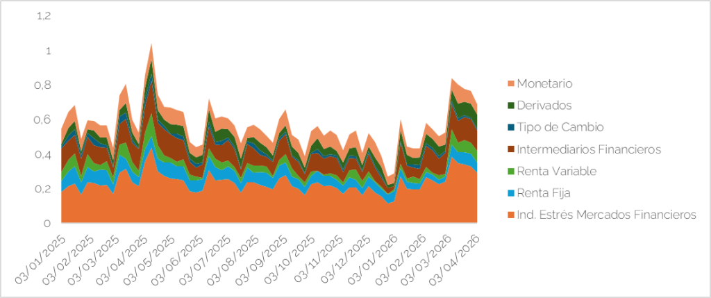 Gráfico 2. Contribución de cada segmento de mercado al Indicador de Estrés de los Mercados Financieros Españoles (2025-2026/1T)