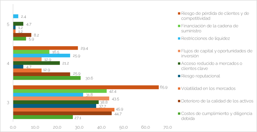 Gráfico 1. Percepción de riesgos geoeconómicos en el sector bancario europeo (% de respuestas. 3-Impacto medio; 4-Impacto alto; 5-Impacto muy alto)