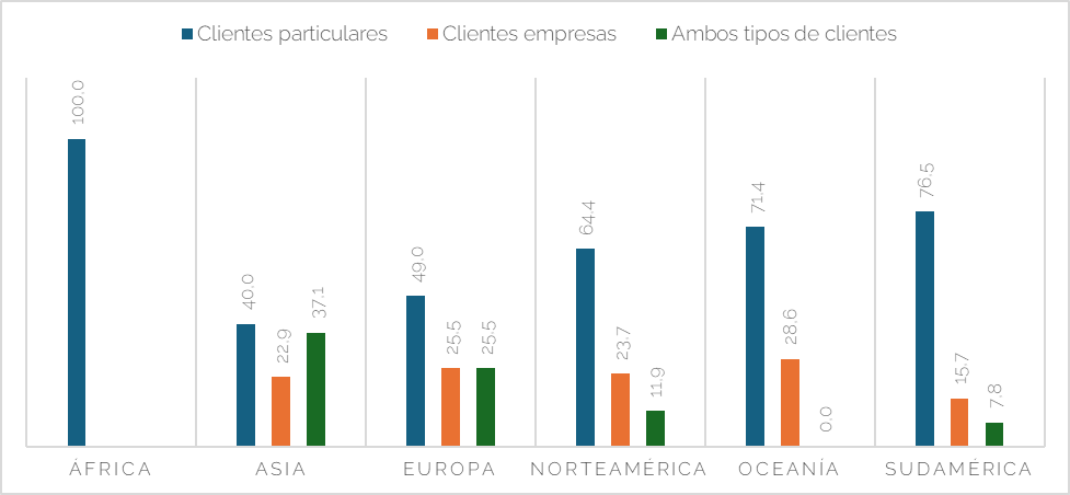 El Gráfico 1 ilustra la diferente orientación del negocio de los neobancos en seis regiones globales, expresada en porcentajes según su foco principal, a saber: clientes particulares, empresas o ambas líneas de negocio. Existe una marcada preferencia por el cliente particular en casi todas las áreas geográficas analizadas, si bien es África la que emerge como un caso extremo de especialización, con el 100% de sus neobancos dedicados exclusivamente a clientes particulares, sin presencia en el segmento empresarial. De manera similar, tanto en Sudamérica (76.5%) como en Oceanía (71.4%) se observa una clara orientación hacia el cliente particular. En Europa, sin embargo, si bien el foco en el cliente particular sigue siendo el mayoritario (49%), la penetración en el segmento de empresas (25.5%) y la presencia de neobancos orientados a ambos tipos de clientela (25.5%) suman más de la mitad del mercado. En contraste, los neobancos norteamericanos orientados hacia el cliente particular (64.4%) tienen una presencia comparativamente baja en la estrategia dual (11.9%). Asia y Europa son, por tanto, las únicas regiones donde la estrategia de focalizar el negocio en ambos tipos de clientes (37.1% y 25.5%, respectivamente) representa una porción significativa del mercado, sugiriendo la existencia de un sector de neobancos más maduro y competitivo, donde este tipo de entidades buscan diversificar sus ingresos o especializarse en el nicho empresarial, algo prácticamente ausente en regiones como África y Oceanía.