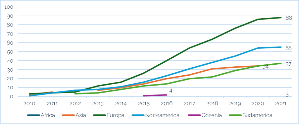 Gráfico 2. Número acumulado de neobancos por región (2010-2021)
