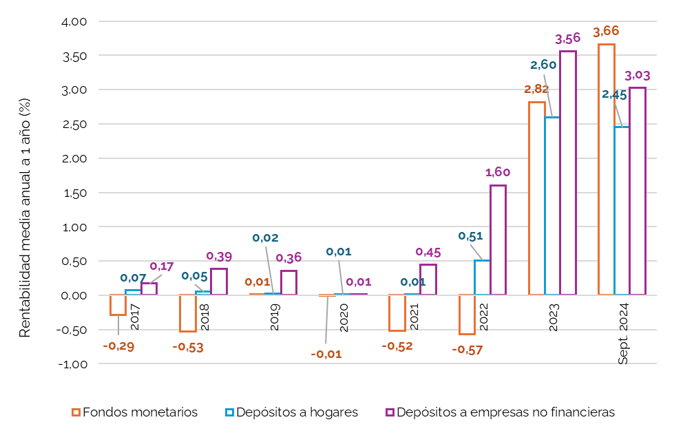 El gráfico 2 compara la rentabilidad de los fondos monetarios a un año con los depósitos a plazo fijo a 12 meses para hogares y empresas. Desde 2017 a 2021, las rentabilidades de los fondos monetarios fueron negativas o casi nulas, mientras que los depósitos a hogares y empresas ofrecían rendimientos bajos, pero generalmente positivos. Esta situación refleja el entorno de tipos de interés en la Eurozona. A partir de 2022, las subidas de tipos de interés por parte del Banco Central Europeo (BCE) cambiaron el panorama. Como puede observarse, estas subidas de tipos oficiales han tenido un mayor impacto en la rentabilidad de los fondos monetarios que en los depósitos, lo que explica en parte, el mayor atractivo que han tenido estos fondos de inversión en los últimos años, y que como recoge el gráfico 1 se han materializado en un incremento de los activos gestionados por ellos. En 2023, la rentabilidad de los fondos monetarios superó a la de los depósitos a los hogares, alcanzando el 2,82%, frente al 2,.60% de los depósitos a hogares. En septiembre de 2024 (dato más reciente), la rentabilidad de los fondos monetarios se situó de nuevo por encima hasta alcanzar el 3,66%, mientras que los depósitos a empresas y hogares se situó en 3,03% y 2,45%, respectivamente.