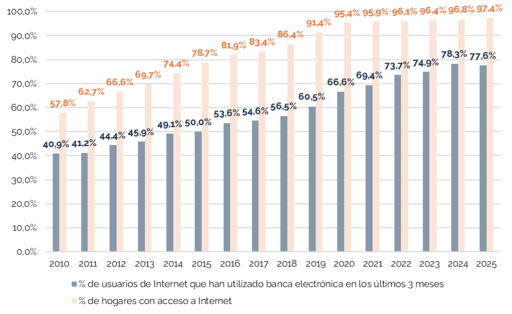 La digitalización bancaria en España ha avanzado de forma muy significativa en los últimos años, hasta el punto de que la banca digital se ha integrado plenamente en la actividad cotidiana de una parte muy relevante de los clientes. El uso de los canales digitales ya no se limita a la consulta del saldo o de los movimientos en la cuenta bancaria, sino que abarca un conjunto amplio de operaciones habituales, como transferencias, contratación de productos, pagos o gestión financiera básica. En términos comparativos, España se sitúa por encima de la media de la Unión Europea en el uso de la banca digital, reflejando el esfuerzo inversor y la estrategia de transformación tecnológica del sector. No obstante, todavía existe margen de mejora si se compara con los niveles de uso observados en los países nórdicos, que continúan marcando la referencia en este ámbito. En cualquier caso, el grado de adopción de la banca digital no es homogéneo ya que persisten diferencias relevantes asociadas a factores sociales, económicos y demográficos, como la edad, el nivel educativo o el entorno geográfico. Estas brechas en su adopción plantean retos adicionales tanto para las entidades financieras como para los reguladores en términos de inclusión financiera y acceso equitativo a los servicios bancarios.