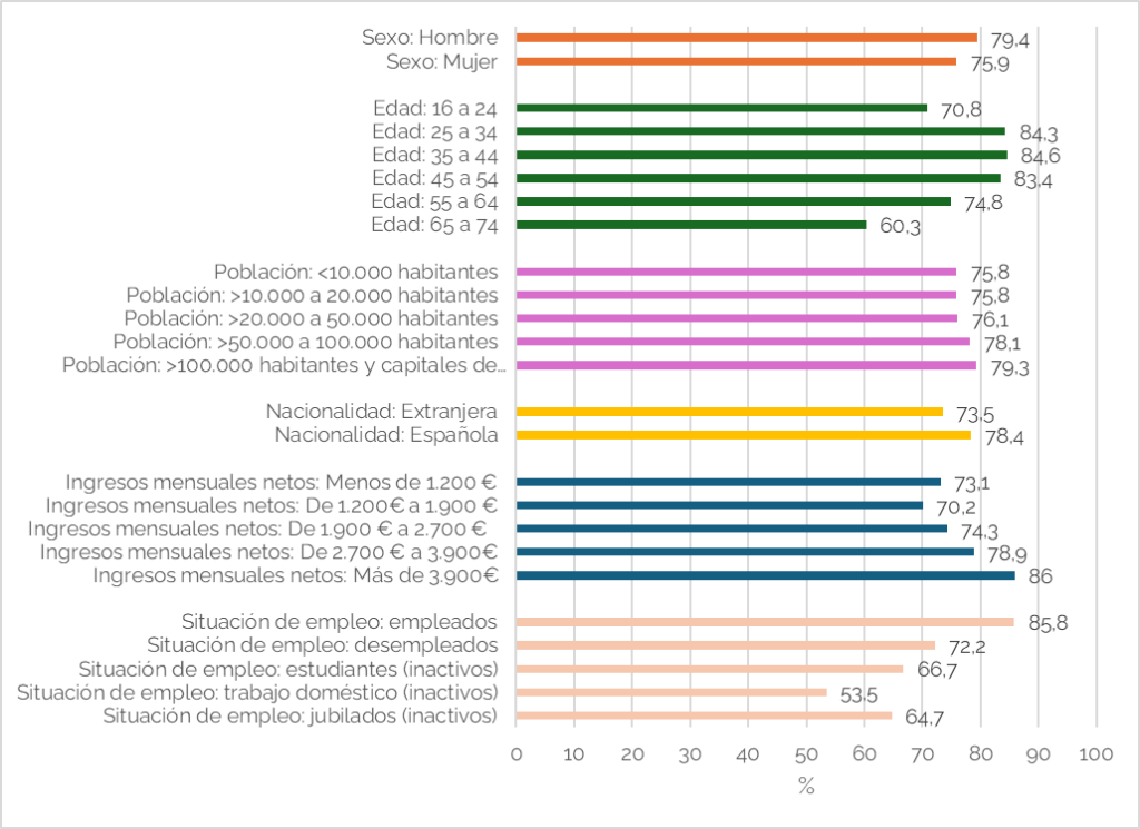 El Gráfico 2, que analiza el perfil del usuario de la banca digital, pone de manifiesto que, aunque el grado de utilización es elevado en términos agregados, persisten brechas relevantes asociadas a determinadas características sociales, económicas y demográficas. Las brechas son más acusadas por edad. Mientras que los grupos centrales de edad, entre 25 y 54 años, presentan niveles de uso superiores al 83%, el porcentaje desciende hasta el 60,3% en el grupo de 65 a 74 años, lo que refleja una clara brecha generacional. Por tamaño del municipio, el uso aumenta gradualmente con el grado de urbanización, desde el 75,8 % en municipios pequeños hasta el 79,3% en grandes ciudades, lo que apunta a una brecha territorial más limitada pero persistente. En términos de nacionalidad, los usuarios de nacionalidad española presentan un mayor uso (78,4%) que los de nacionalidad extranjera (73,5%). Por otra parte, las diferencias por nivel de ingresos son especialmente significativas. El uso de la banca digital pasa del 70,2% en los tramos de renta media-baja a un 86% entre quienes superan los 3.900 euros mensuales. Finalmente, la situación laboral también introduce diferencias relevantes, con una elevada adopción entre los ocupados (85,8%) frente a niveles sensiblemente inferiores entre desempleados (72,2%), estudiantes (66,7%), personas dedicadas al trabajo doméstico (53,5%) o jubilados (64,7%). En cualquier caso, pese a que todavía existen diferencias, la realidad es que se han acortado sensiblemente en los últimos años.