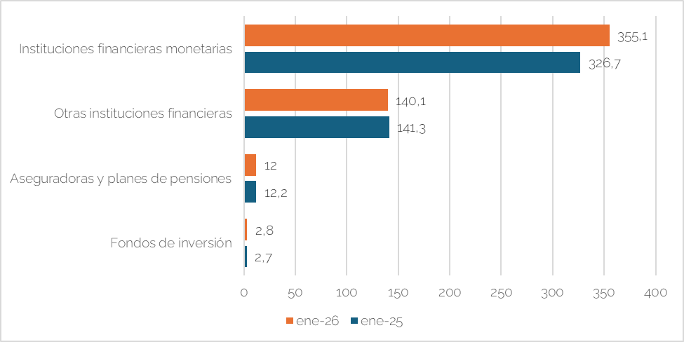 El Gráfico 1, elaborado a partir de datos proporcionados por el Banco Central Europeo (BCE)[1] muestra la emisión de títulos de deuda “verdes” por parte de los distintos actores del sector financiero europeo en enero de 2025 y 2026. Las instituciones financieras monetarias -esto es, principalmente bancos- continúan siendo, con diferencia, los principales emisores de este tipo de instrumentos de financiación. Según los últimos datos, en enero de 2026 las emisiones de deuda “verde” por parte de los bancos europeos alcanzaron un volumen de 355,1 miles de millones de euros, frente a 326,7 en enero de 2025. Esta realidad refleja un incremento significativo durante el último año y confirma el creciente protagonismo de la banca en la financiación de proyectos medioambientalmente sostenibles. En el segmento de otras instituciones financieras, el volumen de emisión se mantiene prácticamente estable, con una ligera reducción durante el último año (de 141,3 a 140,1 miles de millones de euros). A pesar de esta disminución, el nivel sigue siendo elevado, lo que pone de manifiesto que este tipo de instituciones también desempeñan actualmente un papel relevante en el mercado de la financiación sostenible. Aseguradoras y planes de pensiones presentan volúmenes mucho menores, representando alrededor de 12 miles de millones de euros en ambos años. Aunque es cierto que este tipo de entidades gestionan grandes volúmenes de activos, parece claro que su papel como emisores de títulos de deuda verde es notablemente inferior al mostrado por el sector bancario en la actualidad. Finalmente, los fondos de inversión muestran el menor volumen de emisiones, con 2,8 y 2,7 miles de millones de euros en 2026 y 2025, respectivamente.