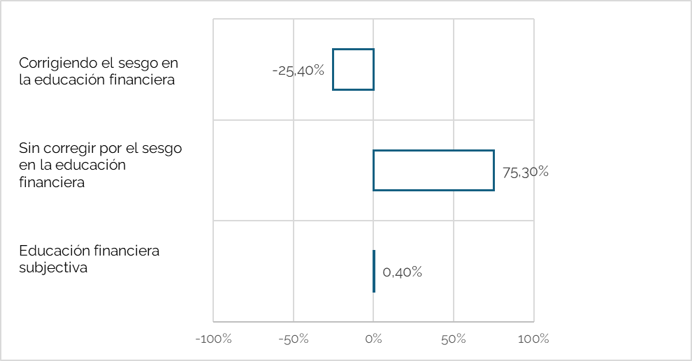 El estudio muestra que la educación financiera tiene un papel crucial en la decisión de poseer criptomonedas, incluso por delante de otros factores como la edad, el nivel de ingresos o la actividad digital desarrollada por el individuo. La investigación revela que las personas con mayor educación financiera objetiva – es decir, aquella que ha sido realmente examinada - tienen menos probabilidad de poseer criptomonedas, señalando la necesidad de mejorar esta educación para tomar decisiones informadas sobre esta clase de activos digitales. De hecho, se estima que cada incremento unitario en el nivel de educación financiera reduce la probabilidad de poseer criptomonedas en un 0,2. Sin embargo, la clave parece estar en los sesgos que los individuos pueden presentar entre su nivel de educación financiera objetiva y la subjectiva – es decir, la que se basa en las percepciones o o el nivel de confianza personal que tiene el individuo respecto a sus conocimientos financieros. Se habla de sesgos cuando existe una elevada discrepancia entre el conocimiento financiero objetivo - lo que una persona realmente sabe - y el conocimiento financiero subjetivo - lo que una persona cree saber. Este desajuste puede llevar a comportamientos financieros que pueden generar problemas, ya que las personas con un alto nivel de confianza en su capacidad financiera, pero con conocimientos reales limitados, pueden asumir riesgos innecesarios o tomar decisiones mal informadas. En este sentido, la investigación revela que estos sesgos en el nivel de educación financiera tienen un efecto significativo en la probabilidad de poseer criptomonedas. De hecho, se estima que aquellos individuos con mayores sesgos tienen un 75,3% más de probabilidad de poseer criptomonedas que aquellos con menos sesgos. Sin embargo, cuando se corrigen dichos sesgos (se muestra el nivel “real” de formación financiera), la educación financiera tiene un efecto negativo (menor tenencia de criptoactivos) del 25,4% en la probabilidad de poseer criptomonedas. El Gráfico 2 resume estos resultados.