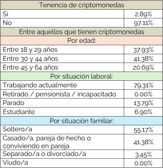 Tabla 1. Patrones de tenencia de criptomonedas entre población con bajos ingresos (hogares con rentas anuales por unidad de consumo inferiores a 13.600 euros) en España