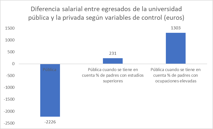 Cuando se introduce información sobre el origen socioeconómico de los estudiantes, el panorama cambia sustancialmente. Al comparar titulados de universidades públicas y privadas procedentes de hogares con un nivel educativo similar, el coeficiente negativo asociado a haber asistido a una universidad pública desaparece. Los ingresos de los titulados de universidades públicas y privadas son muy similares entre estudiantes con un entorno familiar educativo comparable, e incluso en algunos casos se convierte en favorable para los primeros.