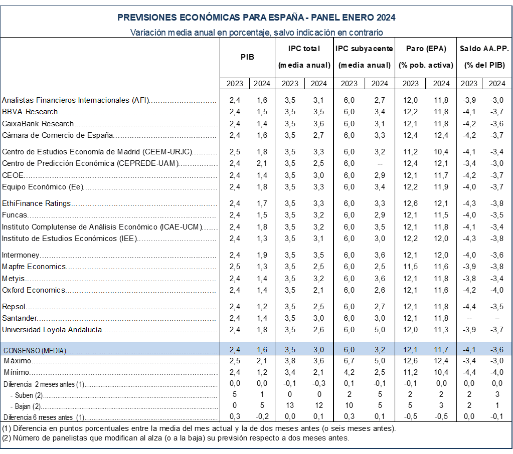 Tras la moderación del IPC general en los últimos meses de 2023, la previsión para la tasa media anual de 2024 baja tres décimas, hasta el 3%. La tasa interanual de diciembre sería del 2,7%. En cuanto a la inflación subyacente, la previsión de la tasa media anual se reduce en una décima, hasta el 3,2%.