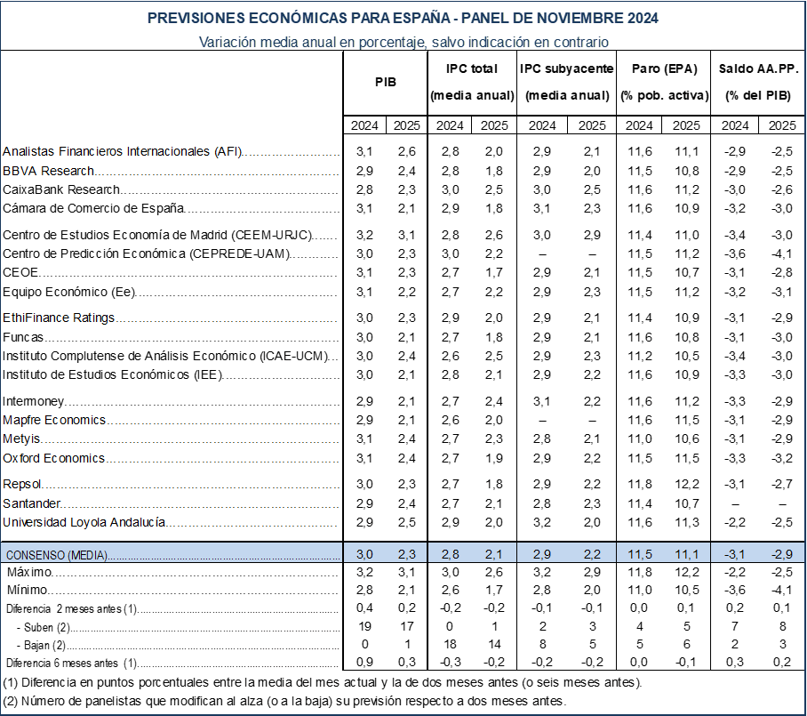 Madrid, 12/11/2024 | Los 19 servicios de estudios participantes en el Panel de Funcas han mejorado su previsión de crecimiento del PIB para 2024, tras las últimas revisiones al alza por parte del INE. Así, el consenso prevé ahora un crecimiento de la economía española del 3%, cuatro décimas más que en el Panel de septiembre, si bien algunos panelistas esperan un impacto negativo en el crecimiento del cuarto trimestre como consecuencia de la DANA que ha afectado fundamentalmente a la provincia de Valencia.