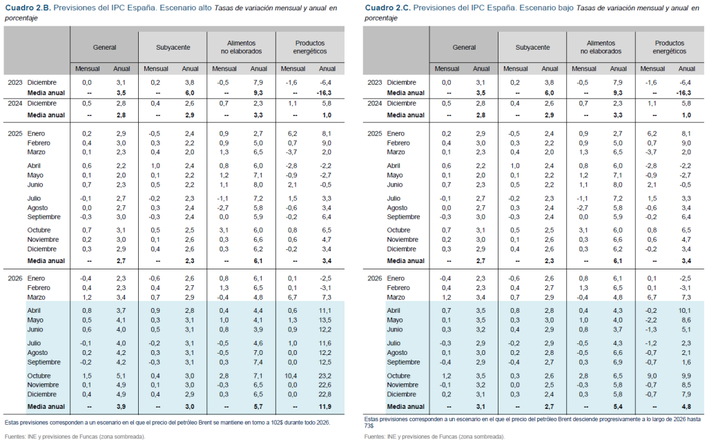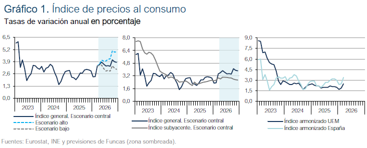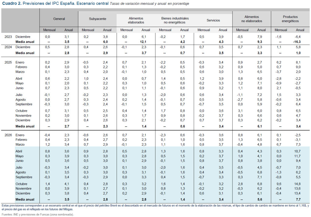 Las previsiones de inflación siguen sujetas a una gran incertidumbre, ya que su evolución estará muy condicionada por el devenir del conflicto en Irán y por el calendario de retirada de las medidas fiscales adoptadas por el Gobierno. En el escenario central de previsiones se parte del supuesto de que el precio del crudo y del Mibgas será el descontado en el mercado de futuros en el momento de la elaboración de esta nota, y que las medidas del Gobierno se mantendrán hasta octubre. Bajo estas condiciones, la inflación general en los próximos meses ascenderá hasta cerca del 4%, situándose de media anual en el 3,5%, mientras que la tasa media anual de la subyacente será del 2,8% (cuadro 2). Si las medidas fiscales se retirasen conforme al calendario previsto en el momento actual –es decir, en junio–, la tasa media anual de inflación general sería del 3,8%.