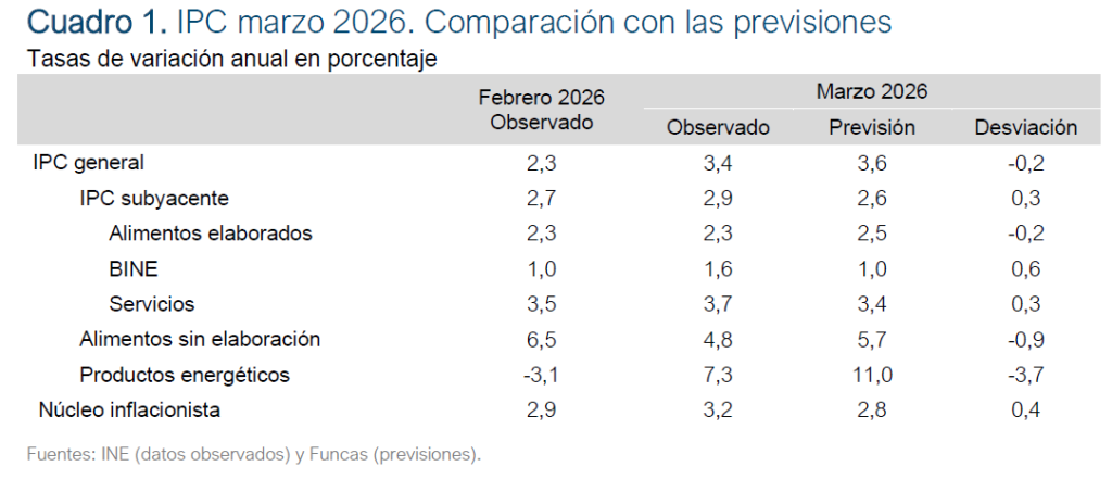 El IPC general aumentó en marzo un 1,2%, elevando la tasa interanual de inflación en 1,1 puntos porcentuales hasta 3,4%, la más elevada desde junio de 2024. La tasa armonizada aumentó nueve décimas hasta, también, el 3,4%, incrementando el diferencial con la media de la eurozona hasta 0,9 puntos. La tasa subyacente se incrementó en dos décimas porcentuales hasta el 2,9%, y el núcleo inflacionista, que excluye todos los alimentos y los bienes energéticos, si situó en el 3,2% –tres décimas más que el mes anterior–.