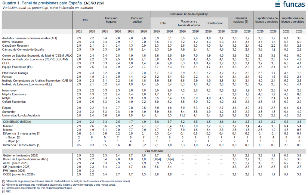 Según el consenso de analistas, el PIB creció un 2,9% en 2025, tal y como adelantó el Panel de noviembre. La demanda nacional habría aportado 3,4 puntos porcentuales al crecimiento del PIB (una décima más de lo esperado en el anterior consenso) y el sector exterior restaría cinco décimas, frente a -0,4 puntos en el Panel de noviembre. Se revisa al alza la estimación de la inversión y de sus principales componentes, mientras que se mantiene la del consumo público y la del privado. Respecto al sector exterior, se espera una décima menos de crecimiento en las exportaciones, mientras que en las importaciones se prevé un avance de tres décimas más respecto al anterior Panel (cuadro 1).