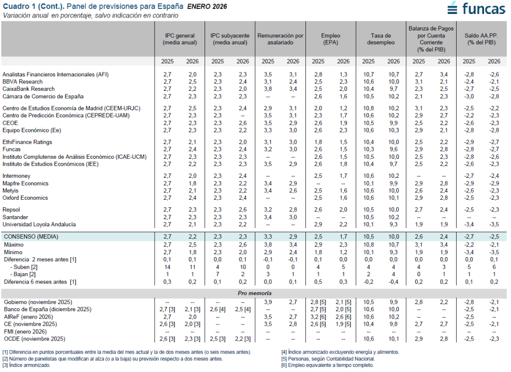 La tasa de desempleo media anual se habría situado, según el consenso, en el 10,5% en 2025, y se reduciría cinco décimas hasta el 10% en 2026 (cuadro 1).