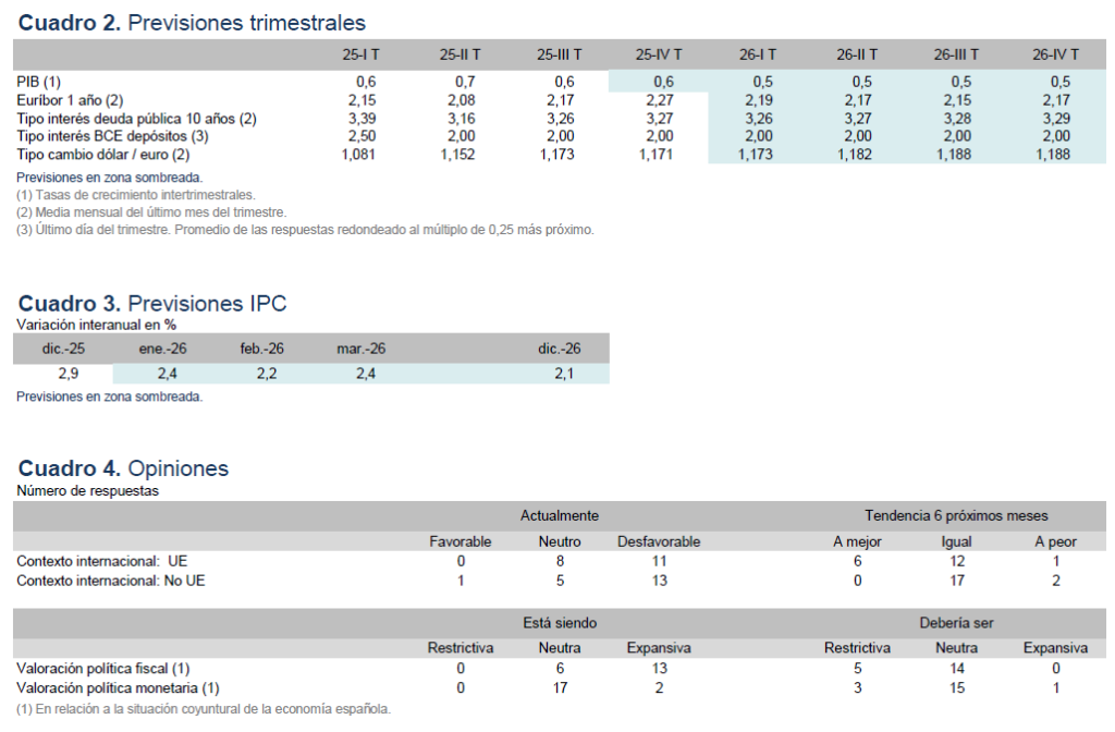 En la misma línea, la previsión de consenso apunta a una facilidad de depósitos del BCE estable del 2% durante el periodo de previsión, sin cambios con respecto a la anterior valoración (cuadro 2). El Euribor se ha revisado ligeramente al alza, en un contexto marcado por la incertidumbre, hasta el 2,17% a finales de año (12 puntos básicos más que en la previsión de noviembre).