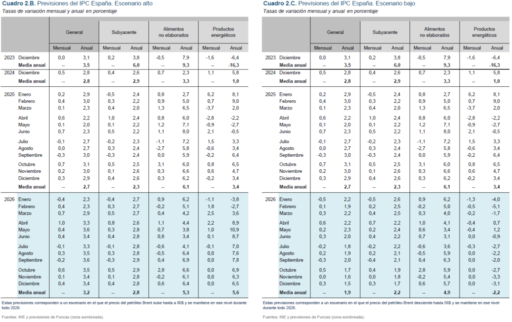 En cuanto al escenario alto, se ha elevado la hipótesis con respecto al precio del crudo hasta 80$, debido al contexto de mayor incertidumbre geopolítica. Es este escenario, la tasa media anual se elevaría hasta el 3,2% en la general y el 2,8% en la subyacente (cuadro 2.B). Finalmente, en un escenario en el que el precio de esta materia prima baja hasta 56$, las tasas medias anuales se situarían en el 1,9% y el 2,2% en la general y en la subyacente, respectivamente (cuadro 2.C).