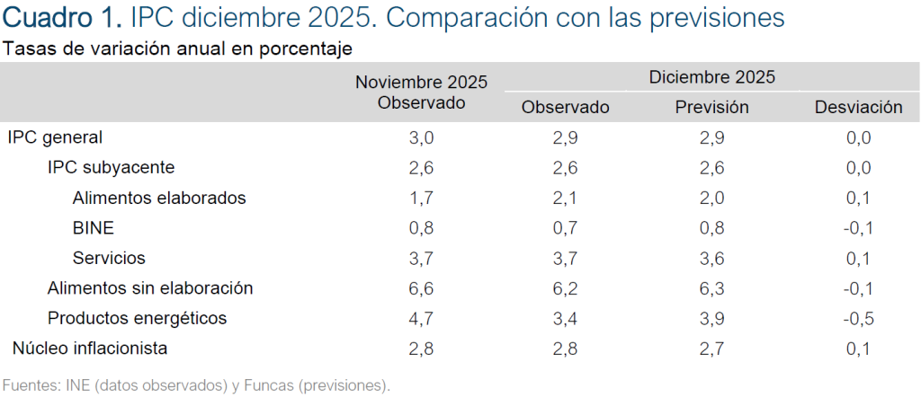 El IPC general aumentó un 0,3% en diciembre, ligeramente por debajo del mismo mes del año anterior, reduciendo la tasa interanual de inflación en una décima porcentual hasta el 2,9%. La tasa armonizada también descendió hasta el 3%, lo que supone un punto porcentual por encima de la media de la eurozona. La tasa subyacente se mantuvo sin cambios en el 2,6%, mientras que el núcleo inflacionista –que recoge los precios de los bienes no energéticos y los servicios– también repite tasa interanual, en el 2,8%.