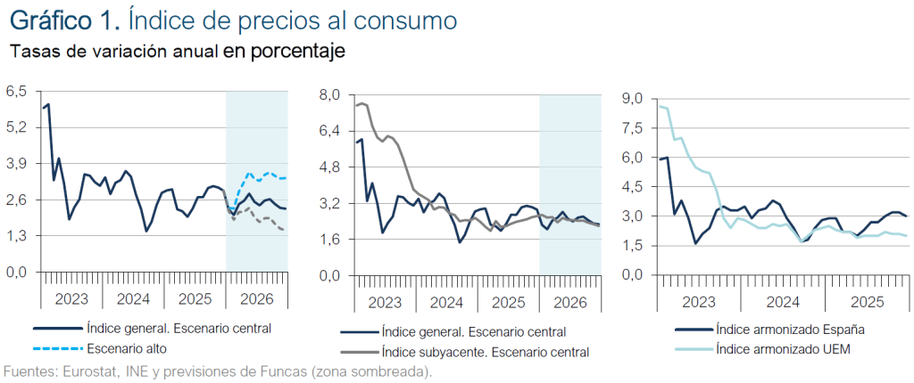 El precio del crudo se ha mantenido en torno a 63$ en las últimas semanas, un nivel muy semejante al registrado el mes anterior. Puesto que no se han producido grandes cambios, se mantiene la hipótesis del escenario central de previsiones, que parte de una cotización para esta materia prima de en torno a 65$ para todo el periodo de previsión. Por tanto, no hay apenas modificaciones en las previsiones en el escenario central para 2026, que se mantienen una media anual del 2,4% tanto para la tasa general como para la subyacente. Ambas se mantendrán, con altibajos, por encima del 2% todos los meses del año (cuadro 2).