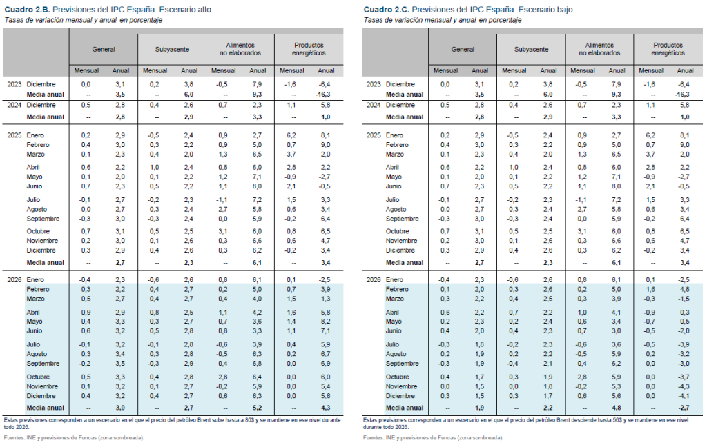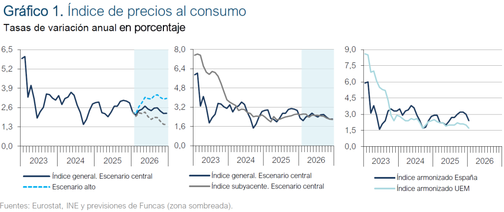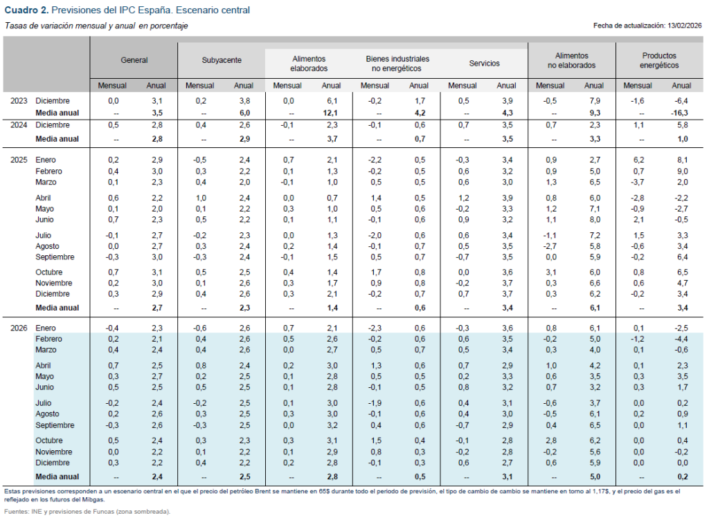 El precio del crudo en las últimas semanas no se ha distanciado excesivamente del contemplado en el escenario central de hipótesis, por lo que se mantiene el supuesto de partida de una cotización para esta materia prima de en torno a 65$ para todo el periodo de previsión. Bajo este supuesto, se mantiene la previsión del 2,4% de media anual para la tasa general (por debajo del 2,7% observado en 2025). La cifra esperada para la subyacente se ha elevado ligeramente hasta una media anual del 2,5%, lo que supone un aumento con respecto a la inflación subyacente registrada en 2025 (cuadro 2). Esto obedece a que, aunque para los BINEs y los servicios se espera una inflación algo inferior a la de 2025, la previsión para el grupo de alimentos elaborados es de un ascenso, desde el 1,4% registrado en 2025 hasta un 2,8%. La inflación en este grupo durante el pasado año estuvo contenida por la fuerte caída del precio del aceite de oliva, que compensó en gran medida el ascenso de la inflación en el resto de componentes. En 2026 este efecto no estará presente, ya que no se espera que el aceite siga bajando de precio (de hecho, se mueve al alza), lo que explica el aumento esperado de la inflación en el grupo de alimentos elaborados, y, en consecuencia, en la tasa subyacente.