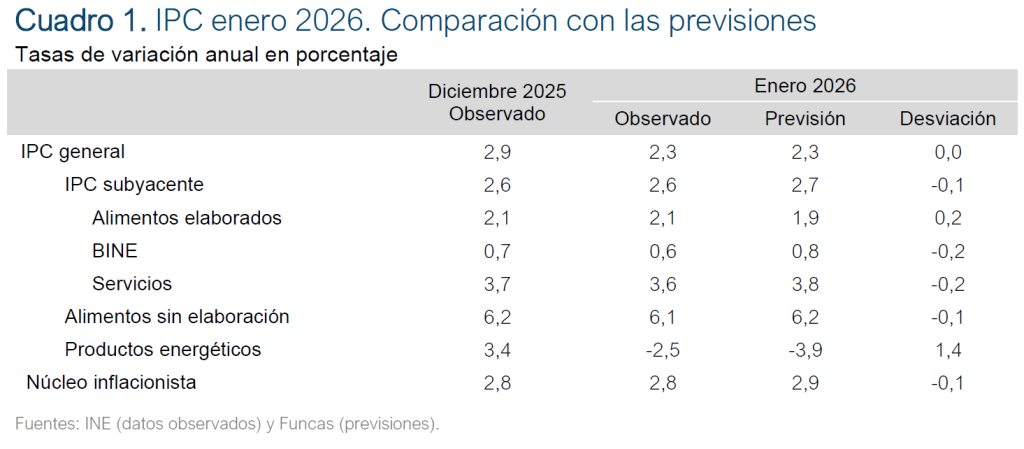 El IPC general descendió en enero un 0,4%, frente al crecimiento registrado el mismo mes del pasado año, lo que ha dado lugar a una bajada de la tasa de inflación de seis décimas porcentuales hasta el 2,3%. La tasa armonizada se redujo hasta el 2,4%, frente al 1,7% de media en la eurozona. La tasa subyacente se mantuvo estable en el 2,6%. El núcleo inflacionista, que excluye los precios de todos los alimentos y la energía, se mantuvo en el 2,8%.