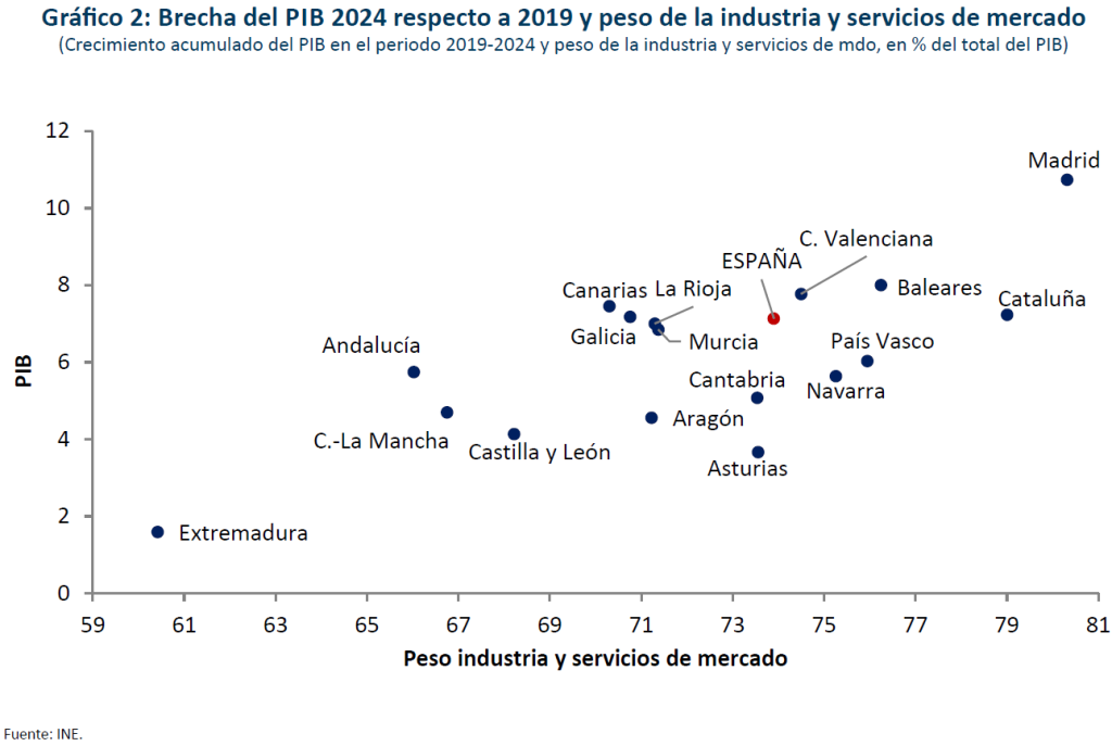 En segundo lugar, la presencia de un sector de servicios de mercado competitivo es otro factor diferencial (gráfico 2), que seguirán aprovechando comunidades como Madrid y Cataluña, con tasas de crecimiento superiores a la media nacional. Estas actividades, que engloban los servicios profesionales de apoyo a empresas, de logística o tecnología, ganan cuotas de mercado a la exportación, al tiempo que atraen fondos europeos.
