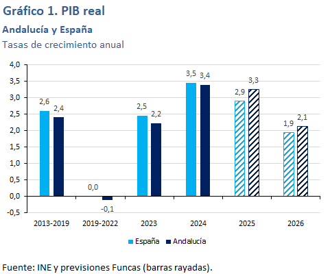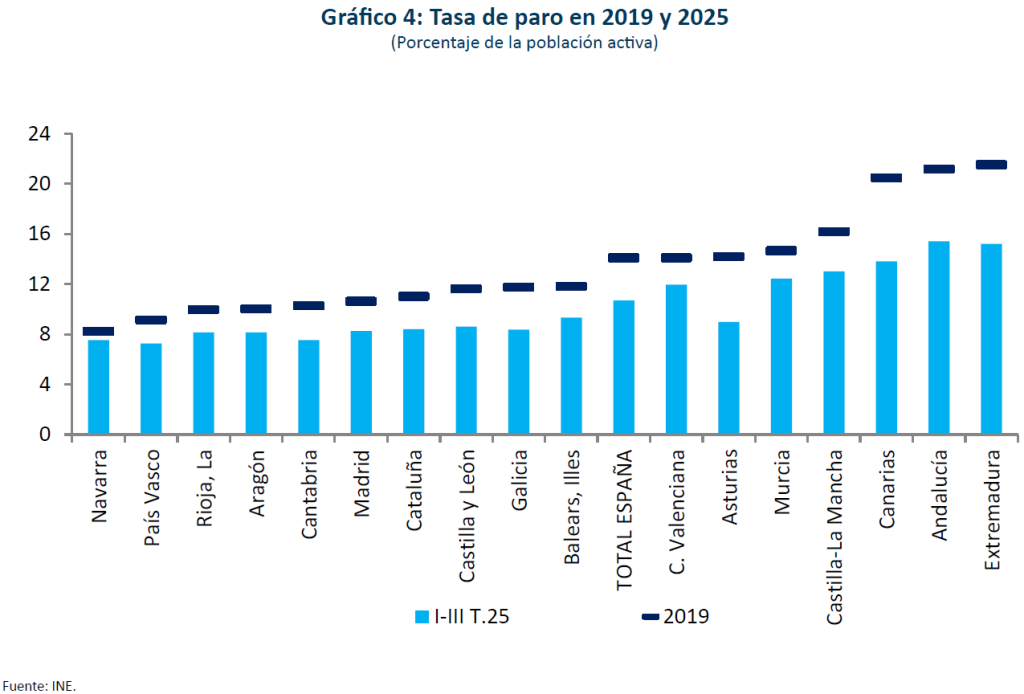 Se estima que el PIB de la comunidad andaluza crecerá un 3,3% en 2025, por encima del 2,9% esperado para el conjunto nacional. Su actividad industrial ha sido extraordinariamente dinámica este año, con un incremento del índice de producción industrial del 8% en el acumulado de enero a septiembre, el mayor de todas las comunidades autónomas, con gran diferencia sobre las siguientes. Además, la desaceleración en el número de turistas ha sido menos acusada que en el resto de las grandes regiones turísticas. En cuanto a la construcción, la evolución en el número de visados y en la licitación apuntan a un ritmo de crecimiento algo superior al conjunto nacional. El avance del empleo hasta octubre ha sido algo mayor que la media, tanto en número de afiliados como de ocupados EPA, habiéndose incluso registrado una aceleración con respecto a 2024. Esta región es una de las que han experimentado un mayor crecimiento de la ocupación y una mayor reducción en la tasa de desempleo en comparación con 2019, si bien ello ha sido a costa de una notable reducción de la productividad (medida con el empleo en términos EPA).