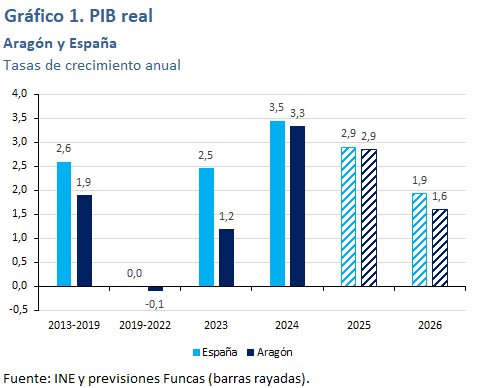 El PIB de Aragón crecerá un 2,9% en 2025, tasa igual a la esperada para el conjunto de España. Su índice de producción industrial crece en 2025 notablemente por encima de la media –un 3,3% hasta septiembre, frente al 1,1% nacional–, aunque sufre una importante caída en sus exportaciones, concentrada en gran medida en el automóvil. El intenso crecimiento de los visados de nueva vivienda y licitación oficial registrado en 2024, así como el fuerte incremento del empleo en el sector de la construcción hasta octubre de 2025, apuntan a un mayor dinamismo del sector que en el conjunto nacional, al contrario de lo que apuntan los indicadores de servicios. La actividad del sector público, medida a través del crecimiento del número de afiliados en las AA.PP., realizaría una aportación nula al crecimiento del PIB, frente a las tres décimas porcentuales que se espera para la media española. El crecimiento del empleo hasta octubre ha sido inferior a la media, tanto en número de afiliados como de ocupados EPA. La tasa de desempleo media anual podría situarse en 2025 por debajo del 8%.