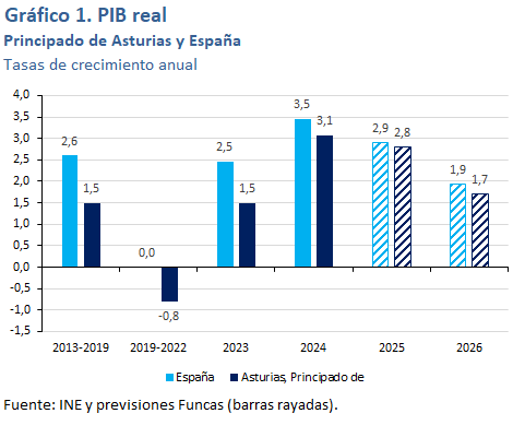 Para 2026 se espera un crecimiento del PIB del 1,7%, por debajo del 1,9% esperado para el conjunto de España. La desaceleración procederá del sector industrial, como consecuencia del debilitamiento de los mercados de exportación, tanto europeos como a nivel global, así como de la construcción, según indica el cambio de rumbo registrado este año por los indicadores adelantados de actividad en este sector tras el crecimiento observado el año anterior. El ritmo de actividad en los servicios se estima que se mantendrá estable. El empleo moderará su avance, lo que, unido al mantenimiento de un elevado crecimiento de la población activa, ralentizará el descenso de la tasa de desempleo, cuya media anual se situará en el 8,4%. Se anticipa un repunte de la productividad, hasta tasas próximas a la media nacional. La proximidad de la tasa de desempleo a su mínimo histórico plantea un cuello de botella para la continuidad del crecimiento, que en otras comunidades se ha contrarrestado con la aportación de mano de obra extranjera, algo que en Asturias ha sucedido en menor medida en estos últimos años.