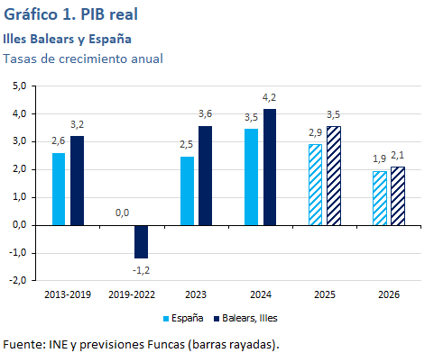 El PIB de Islas Baleares crecerá un 3,5% en 2025. El indicador de actividad en el sector servicios mantiene un ritmo de crecimiento de igual magnitud al del año anterior, sensiblemente superior a la media nacional. La entrada de turistas se ha desacelerado, desde un crecimiento del 6,1% registrado en 2024, hasta una tasa del 3% en el periodo de enero a septiembre de 2025, un ritmo todavía vigoroso. El índice de producción industrial presenta un crecimiento elevado, aunque su aportación al crecimiento del PIB es más modesta por el reducido peso del sector dentro de su estructura productiva. Los indicadores de actividad en la construcción, por su parte, apuntan a un avance muy lento, sensiblemente por debajo de la media nacional. El número de afiliados a la Seguridad Social crecía hasta octubre un 2,6%, ligeramente por encima de la media nacional, si bien el número de ocupados en términos EPA crecía algo menos. La tasa de paro media anual de 2025 caerá por debajo del 9%.