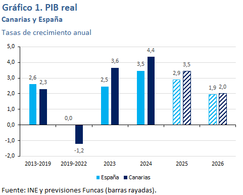 En 2026 el crecimiento del PIB se ralentizará hasta el 2% --una tasa todavía superior a la media nacional--, como consecuencia de un crecimiento en la llegada de turistas muy inferior al observado en los últimos años. La actividad en el sector de la construcción, según avanza la evolución reciente de visados y licitación, seguirá creciendo a mayor ritmo que la media nacional. La tasa de desempleo se situaría en un 11,7% en media anual, el mejor resultado desde 2007.