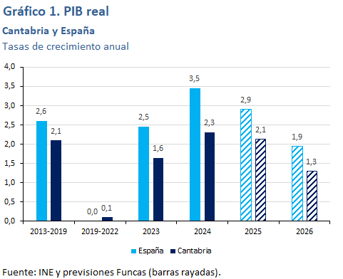 El PIB de la comunidad cántabra crecerá un 2,1% en 2025, por debajo del 2,9% esperado para el total nacional. El ligero descenso del índice de producción industrial acumulado hasta septiembre, unido al incremento moderado en el número de afiliados en el sector, apuntan a un avance modesto de la actividad industrial. La actividad en la construcción, medida a través de la evolución pasada de la licitación oficial y los visados de viviendas, junto al empleo en el sector, habría mantenido un tono de debilidad, sustentándose sobre la construcción de vivienda, más que sobre la obra pública. El impulso de la actividad económica habría procedido básicamente de los servicios, aunque con un crecimiento inferior a la media nacional. La actividad de las AA.PP., medida a través del crecimiento del empleo público, habría realizado una aportación al crecimiento relativamente elevada. Tanto el número total de afiliados a la Seguridad Social como el empleo en términos EPA crecen por debajo de la media, y la tasa de paro se mueve por debajo del 8%.