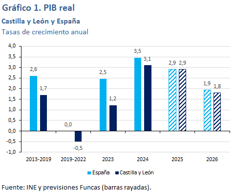 Se estima que el crecimiento del PIB de Castilla y León será del 2,9% en 2025, en línea con la media nacional. El impulso procedería del sector industrial, que crece por encima de la media nacional según se desprende de la positiva evolución del índice de producción industrial y de la afiliación a la Seguridad Social en el sector. Sus exportaciones se comportan de forma muy favorable, impulsadas por los componentes del automóvil –las ventas al exterior de automóviles, sin embargo, registran una caída–, y bienes de equipo –concretamente, equipos generadores de fuerza–. En servicios y construcción, el crecimiento sería algo inferior a la media española. La afiliación a la Seguridad Social crece por debajo del conjunto nacional, si bien el empleo en términos de la EPA crece a un ritmo semejante. Se espera que la tasa de desempleo media anual se sitúe en torno al 8,3%.