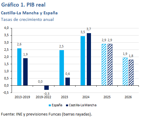 El crecimiento del PIB en Castilla-La Mancha en 2025 será semejante a la media nacional, un 2,9%. El avance del índice de producción industrial es algo más modesto que en el total de España, pero el crecimiento mucho más dinámico del empleo en el sector apunta a un dinamismo de la actividad mayor de lo que sugiere dicho índice. En cuanto a los servicios, tanto el índice de actividad del sector como el número de afiliados apuntan a un ritmo de crecimiento similar al total nacional, aunque su aportación al crecimiento del PIB sería inferior debido al menor peso de los servicios de mercado en su estructura productiva. Esta menor aportación de los servicios de mercado sería contrarrestada por una mayor contribución de los servicios de las AA.PP., a lo que apuntan el elevado ritmo de creación de empleo público, unido al relativamente elevado peso de estos en la economía manchega. Con respecto al sector de la construcción, el crecimiento se estaría sustentando sobre la vivienda, más que sobre la obra pública, a la vista del retroceso sufrido por la licitación oficial el pasado año.