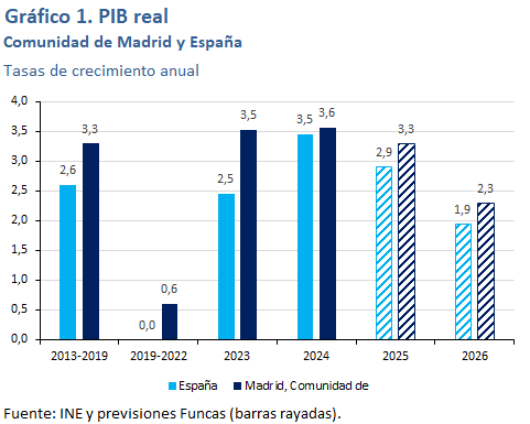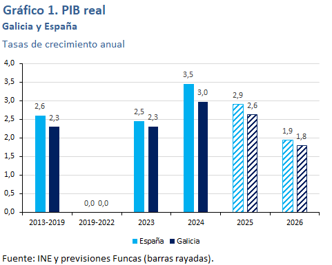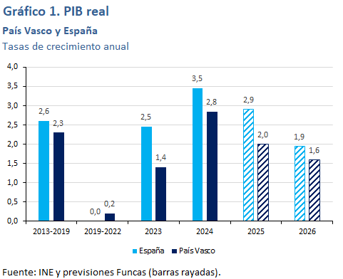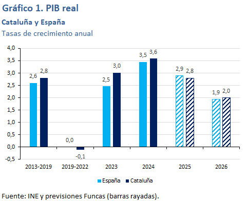 Para 2026 se prevé un crecimiento del 1,9%, en retroceso en relación al presente ejercicio. La desaceleración procederá de la moderación esperada del crecimiento de la población activa, ante la situación que prevalece de escasez de vivienda y el descenso de la movilidad laboral que ya empieza a percibirse en los territorios más dinámicos. Además, las exportaciones seguirán teniendo un comportamiento discreto, particularmente las del sector automotriz, y el turismo frenará su crecimiento.