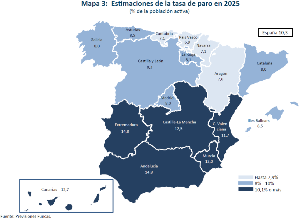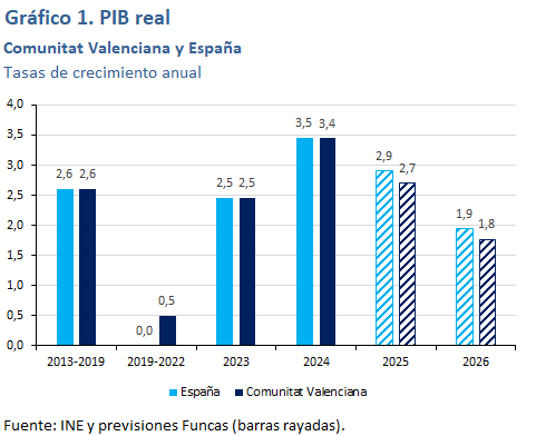 La economía valenciana crecerá un 2,7% en 2025. La industria presenta un tono relativamente débil, con un descenso del índice de producción industrial del 1,5% acumulado hasta septiembre, aunque el moderado crecimiento del número de afiliados en el sector apuntaría a una evolución menos negativa de lo que dicho indicador sugiere, pero, en todo caso, inferior a la media nacional, teniendo además un peso más elevado en su estructura productiva. Los indicadores de servicios apuntan a una evolución en línea con dicha media. La construcción sería el sector que presentaría un crecimiento más destacado, posiblemente el mayor de todas las comunidades autónomas, impulsado tanto por la vivienda como por la obra pública, según se desprende de la evolución de los visados y la licitación. Además, es la región que presenta un mayor ascenso en el número de afiliados en dicho sector. La tasa de desempleo descenderá hasta un 11,7% de media anual, todavía relativamente lejos de su mínimo histórico del 8,3% alcanzado en 2006, a pesar de ser la comunidad donde más ha crecido el empleo desde 2019. Esto se explica porque también es la región donde más ha crecido la población activa, y es también una de las regiones donde más peso ha tenido la mano de obra inmigrante en el empleo creado en los últimos años –un 79% desde 2022–.