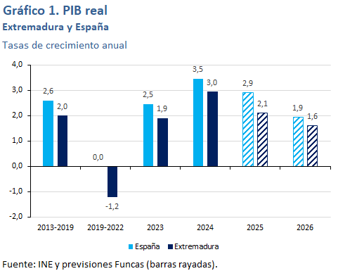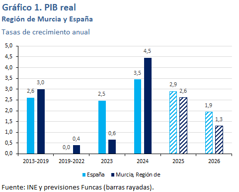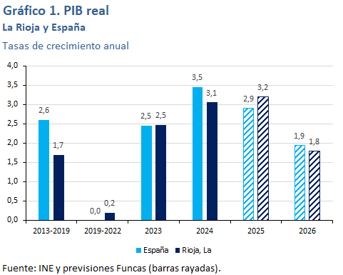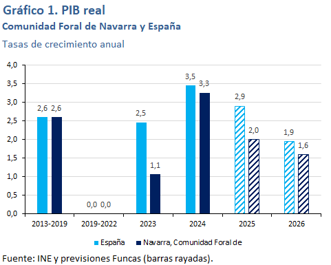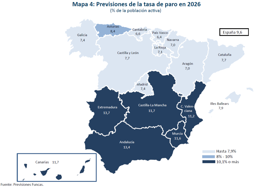Se espera un crecimiento del PIB del 1,8% en 2026. Dentro de su industria tienen un peso superior a la media las ramas menos favorecidas en el ciclo actual, mientras que el peso de las ramas más dinámicas es inferior a la media. Lo mismo sucede en su sector servicios. No obstante, el fuerte crecimiento en el periodo más reciente de los visados de nueva vivienda y de la licitación oficial avanzan un crecimiento muy intenso de la actividad en el sector de la construcción. La tasa de desempleo se reducirá hasta el 11,2%.