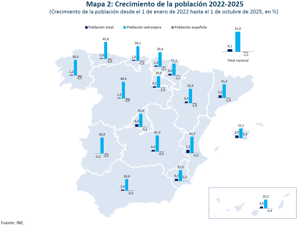 Para 2026 se prevé un crecimiento del PIB del 1,8%, ligeramente por debajo de la media nacional. Independientemente de la positiva evolución de la industria en 2025, el peso en su economía de las ramas con peor comportamiento en este ciclo es relativamente elevado. Dentro de los servicios, el peso moderado de las ramas más dinámicas apunta a un crecimiento en torno a la media. La actividad en el sector de la construcción no crecerá de forma destacada. La tasa de paro caería por debajo del 8%, acerándose al mínimo histórico del 7,1% de 2007, lo que puede suponer un cuello de botella para la continuidad del crecimiento, que solo la aportación de mano de obra inmigrante está contrarrestando. De hecho, esta es una de las comunidades donde mayor es la participación de los extranjeros en el total de empleo creado desde 2022 –un 82% conforme a las cifras de la EPA–.