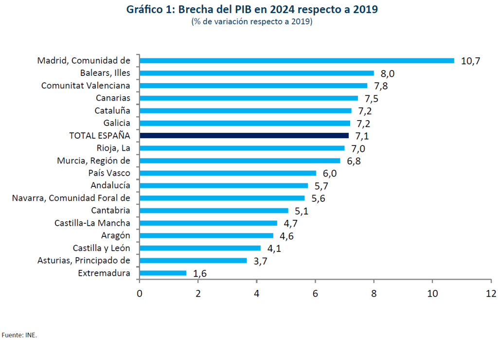 Las fuerzas y debilidades del actual ciclo expansivo de la economía española en su conjunto se reflejan en las previsiones de crecimiento para las comunidades autónomas. Las informaciones más recientes aportadas por el INE en materia de PIB de las comunidades autónomas se refieren al año 2024. Ese año, todas las comunidades habían recuperado su nivel de actividad anterior a la pandemia (gráfico 1), en línea con lo previsto por Funcas. Para 2025, se ha procedido a una estimación desglosada por región basada en los indicadores disponibles de actividad de cada territorio, y en coherencia con el resultado para el conjunto del país conforme a la previsión de Funcas. Para 2026, las proyecciones regionales parten de la previsión de Funcas para el total de la economía española.