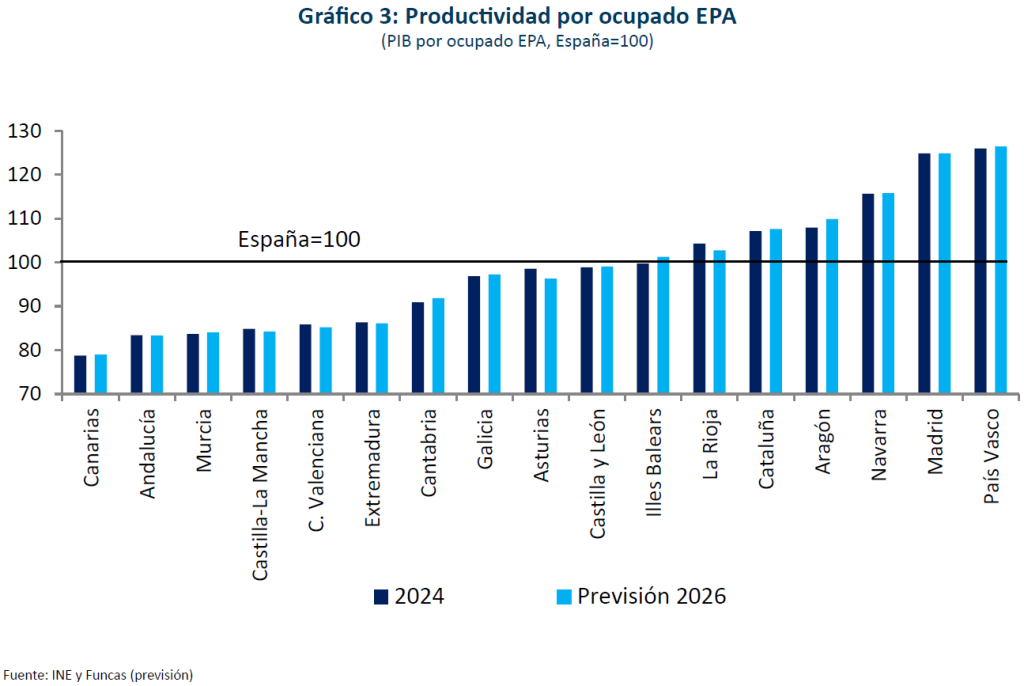 A la inversa, el comportamiento de la industria será dispar. Algunas comunidades con un fuerte peso de ese sector, como Aragón, Castilla y León, Castilla-La Mancha y La Rioja, se benefician en 2025 del tirón de ramas ligadas al programa Next Generation o a las energías renovables. Sin embargo, una moderación es previsible para el año que viene, a medida que se agotan los fondos europeos. Los resultados de otras comunidades industriales serán relativamente discretos tanto este año como el que viene, ya sea por el periodo de ajuste del sector automotriz o por dificultades para encontrar personal cualificado. Finalmente, los factores de oferta que son el crecimiento de la población activa y de la productividad, serán cada vez más relevantes, particularmente en las comunidades que se acercan a mínimos históricos de tasa de paro, es decir, allí donde la capacidad productiva puede empezar a ser insuficiente para satisfacer el aumento de la demanda (circunstancia en la que se encuentran ya algunas economías centro-europeas). En este sentido, el auge de la población activa, gracias a la inmigración contribuye a explicar que una comunidad como Asturias haya pasado a crecer a tasas cercanas a la media nacional, tras un periodo de declive relativo (mapa 2). A la inversa, en las comunidades del valle del Ebro y en Galicia, el shock poblacional no parece tener la envergadura suficiente –ya sea cuantitativamente o en términos de composición sectorial de la mano de obra extranjera-- para compensar plenamente los fenómenos de escasez de mano de obra que prevalecerán en estos territorios hasta el final del periodo de previsión. Con el tiempo, sin embargo, el repunte de la productividad en estos territorios abrirá un nuevo espacio para el crecimiento (gráfico 3).